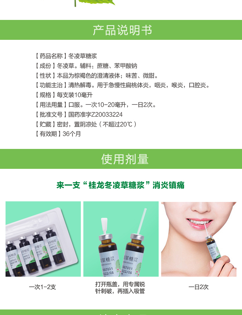 冬凌草糖浆功能主治: 清热解毒。用于慢性扁桃体炎,咽炎,喉炎,口腔炎。本品为棕褐色的澄清液体,味苦、微甜。口服,一次10~20毫升,一日2次。如与其他药物同时使用可能会发...