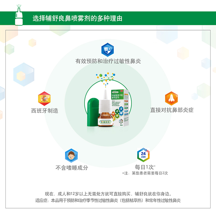 辅舒良丙酸氟替卡松鼻喷雾剂用于预防和治疗季节性过敏性鼻炎(包括枯草热)和常年性过敏性鼻炎。...
