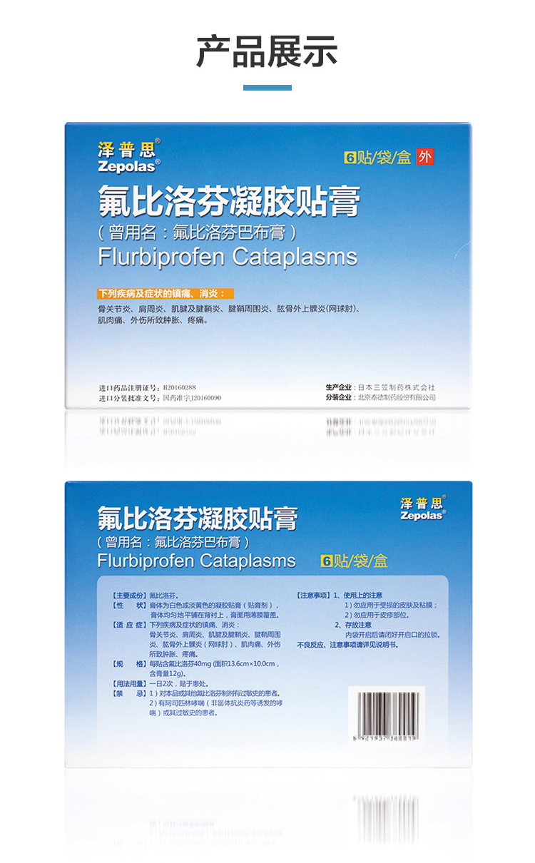 【药代动力学】 1.血药浓度 (1)健康成年人单次贴敷时(14小时),血药浓度的达峰时间为13.8±1.3小时,峰浓度为38.5±5.9ng/mL,半衰期为10.4±0.8小时。(n=10,mean±SE)。 (2)健康成年人反复贴敷时(1日2次,29日),血药浓度在第4日后达到稳态,剥离48小时后从血中消失,确认没有蓄积性。 2.组织内变化 用于骨关节炎等患者时的组织内变化,与等量氟比洛芬(40mg)口服给药相比,滑膜中浓度稍低,皮下脂肪、肌肉内浓度相近。(图表详见说明书) 3.代谢及排泄健康成年人单次贴敷时(14小时),至72小时的尿中总排泄量为1.94%,代谢物与口服用药时几乎相同。